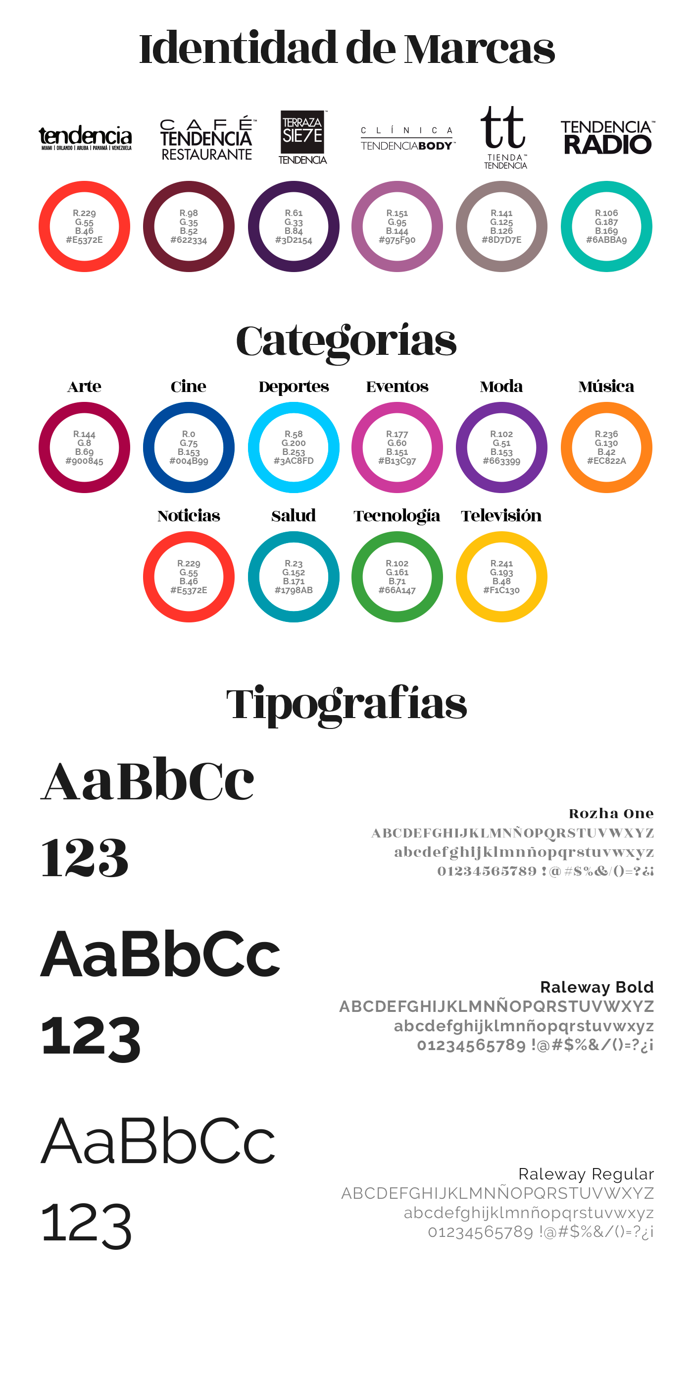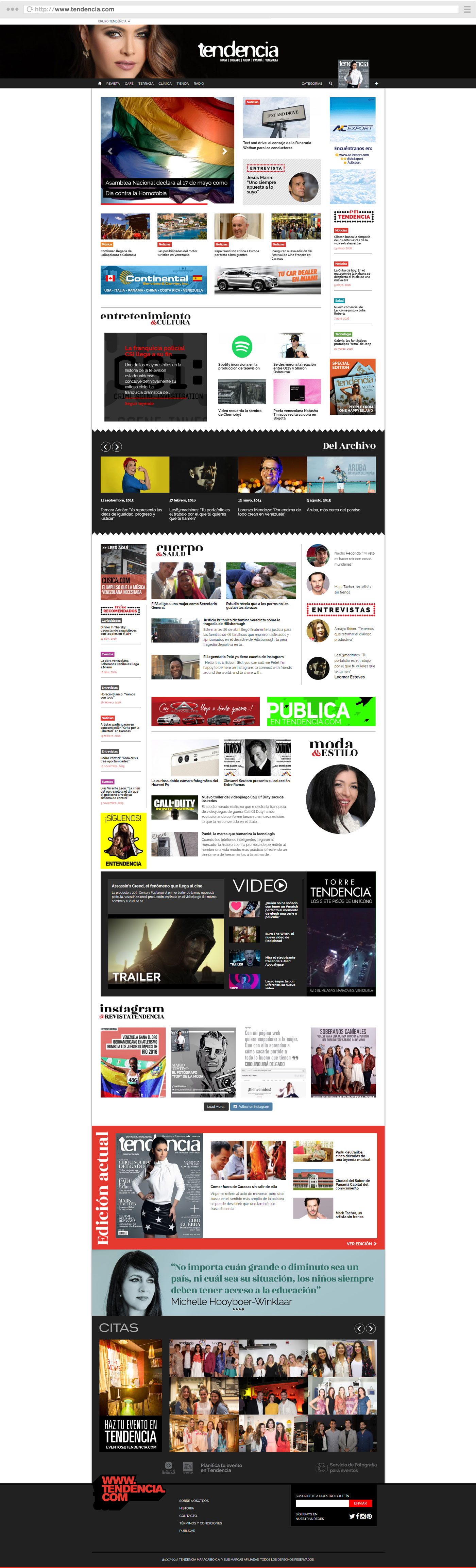 During 2015, was made this project which implied the design of a graphic interface (desktop and mobile) that holds all Tendencia's brands, simultaneously with various categories of content distributed by a colour pallette.